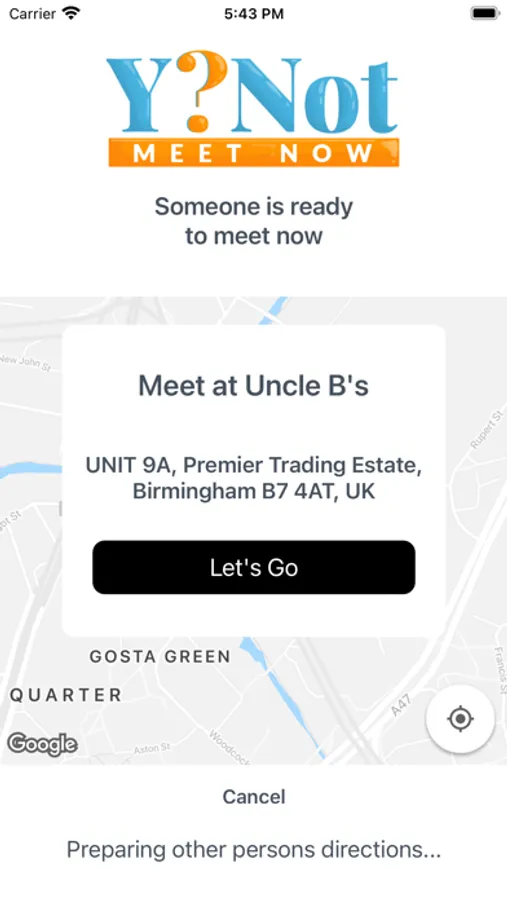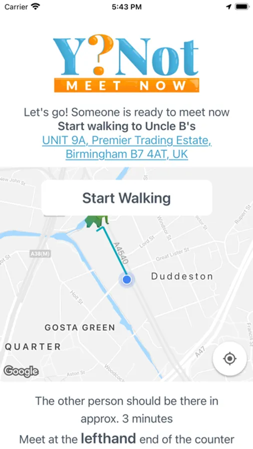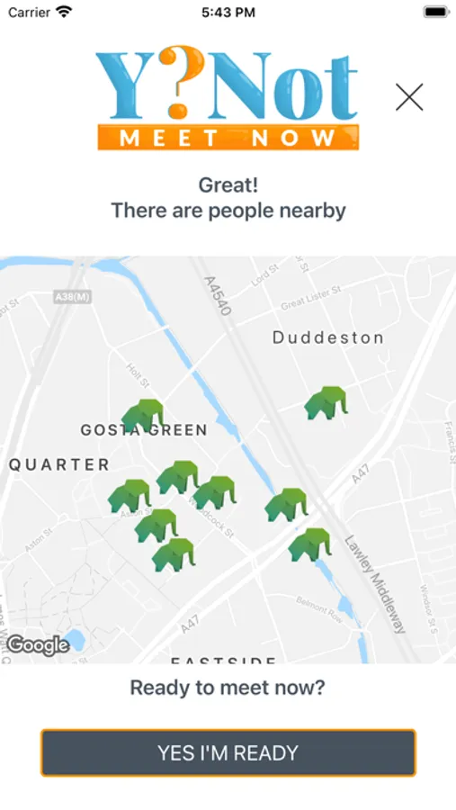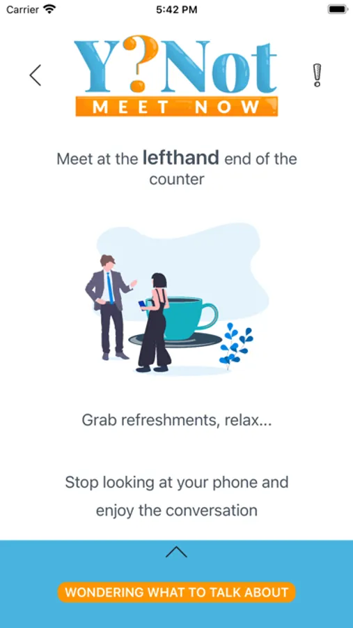 Y?Not uses your phone, to find someone nearby and then guides you both automatically to a public meeting spot, where you can get to know each other for 10 minutes or more over a coffee and a chat.