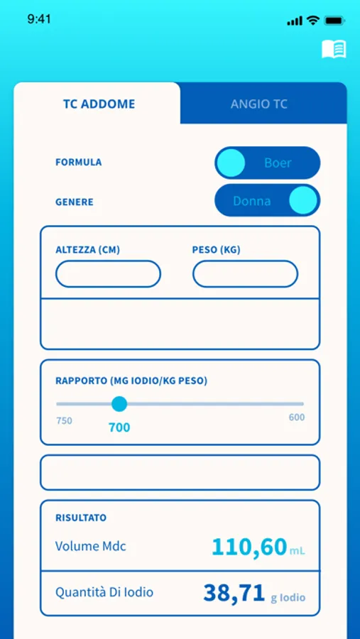 Per la TC addome, l'app consente il calcolo del volume del mezzo di contrasto da somministrare in considerazione la massa magra calcolata e la concentrazione del mezzo di contrasto scelto.