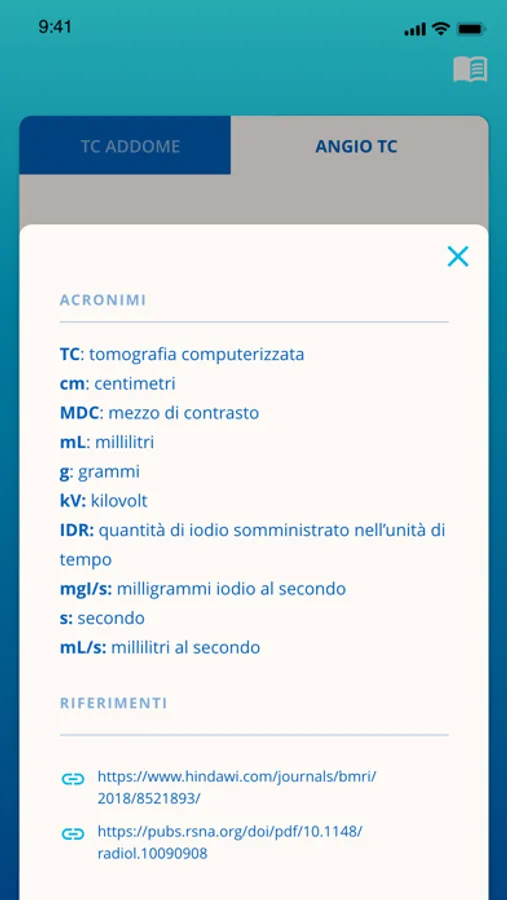 Questa app è perfetta per essere uno strumento che supporta il radiologo nella pratica clinica quotidiana, semplificando il calcolo della dose di mezzo di contrasto per le procedure più frequentemente eseguite come TC addome e l'angiografia TC.