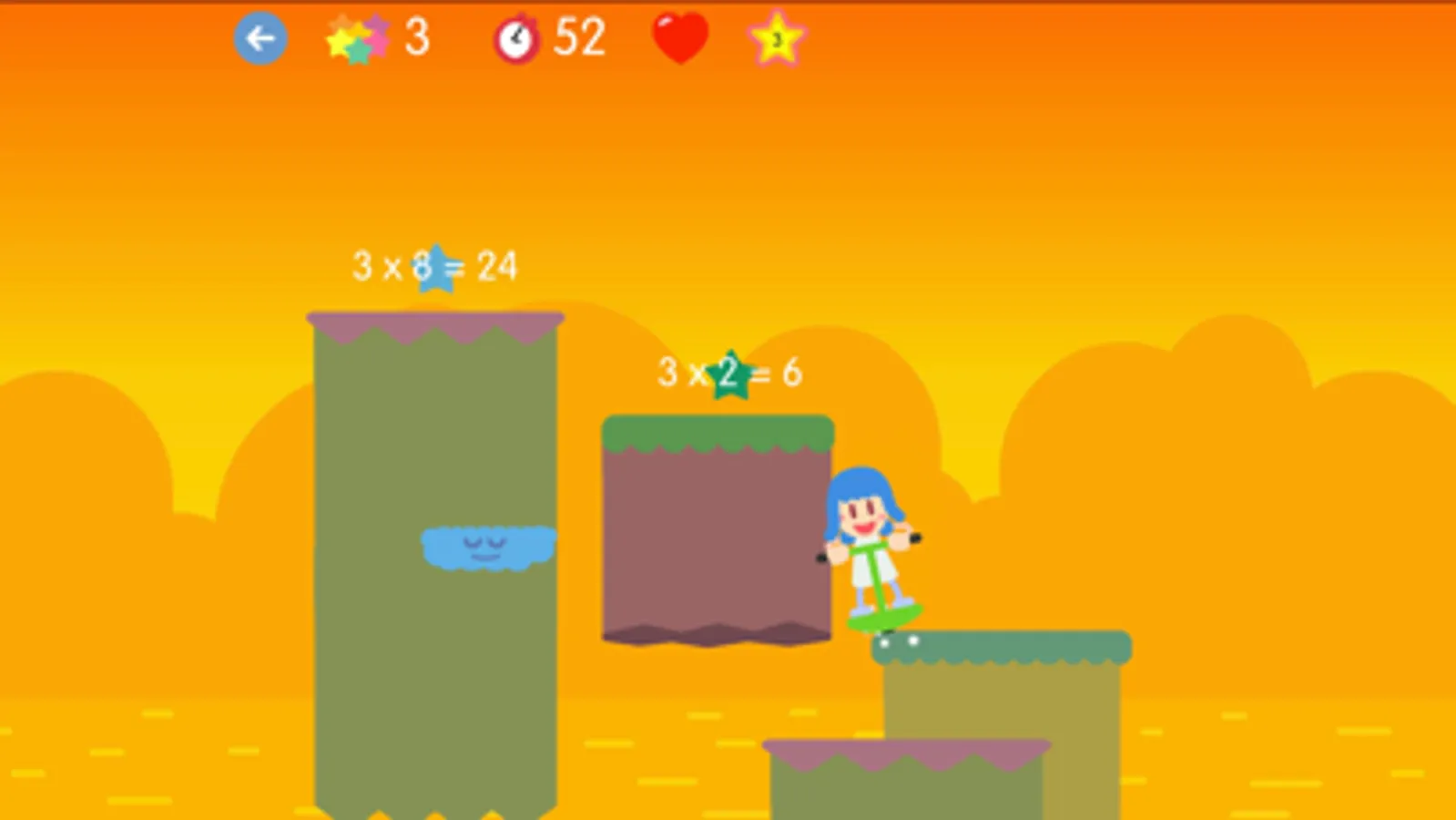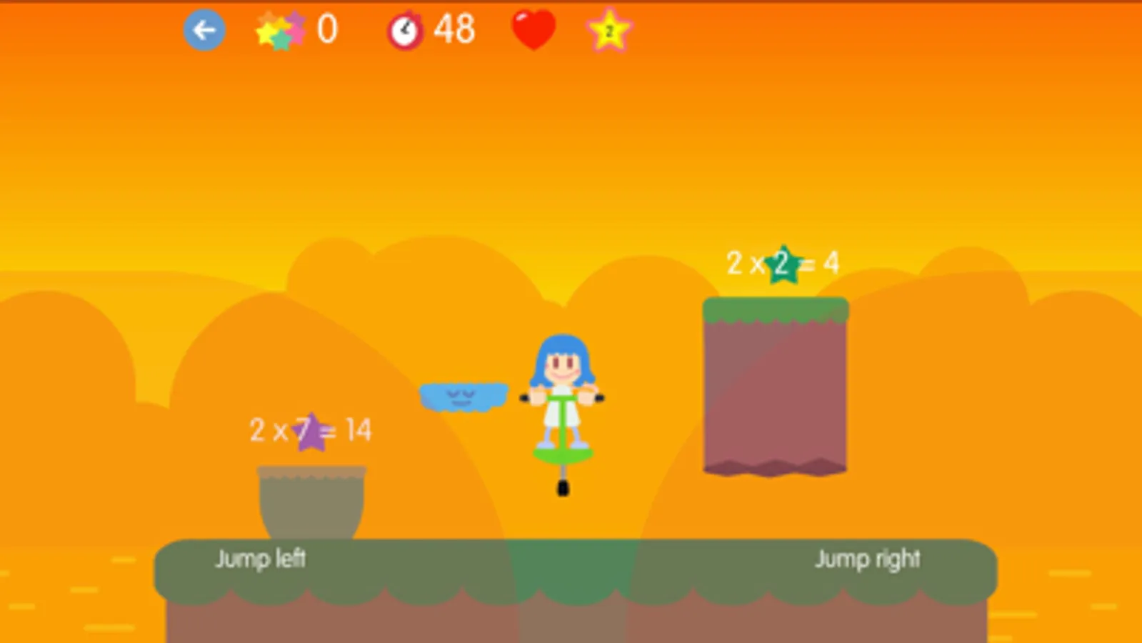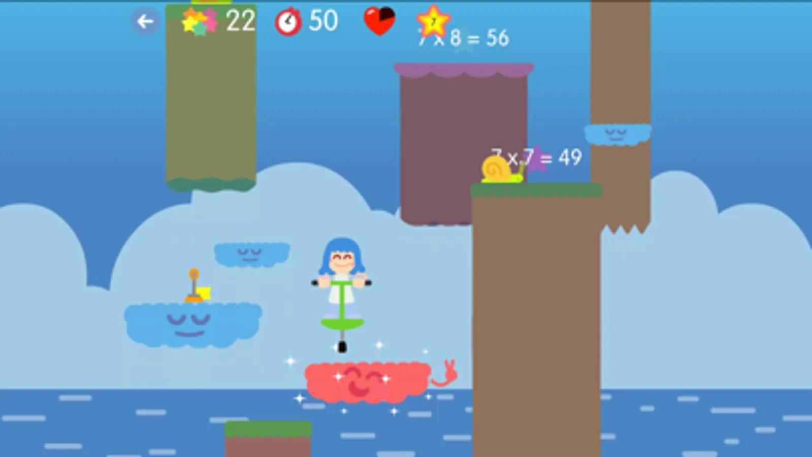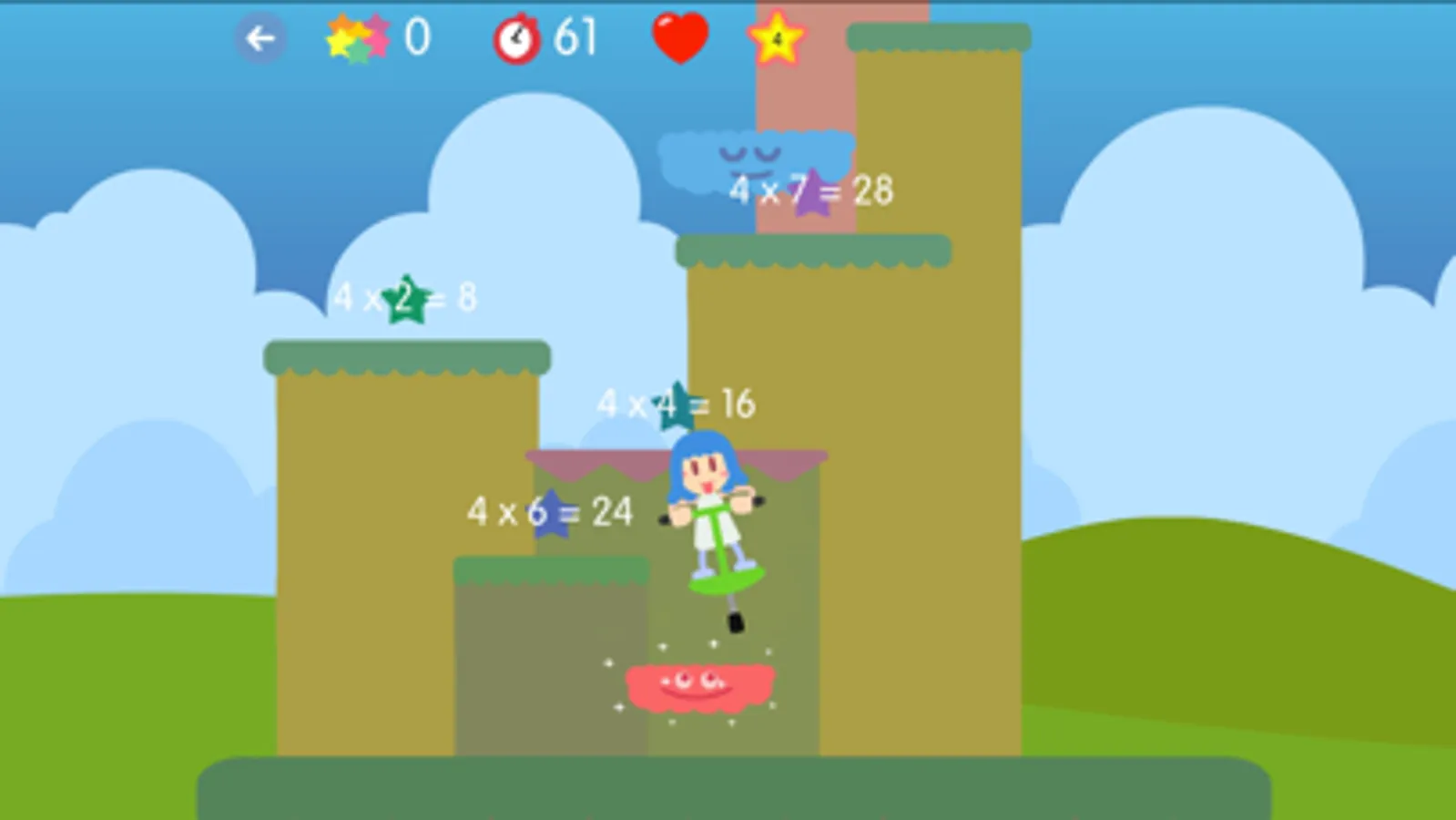 The game consists of reaching the top of the level, jumping from platform to platform and collecting multiplications to earn points. Some platforms, those in the form of a cloud, will ask for a multiplication and you must answer correctly in order to continue.