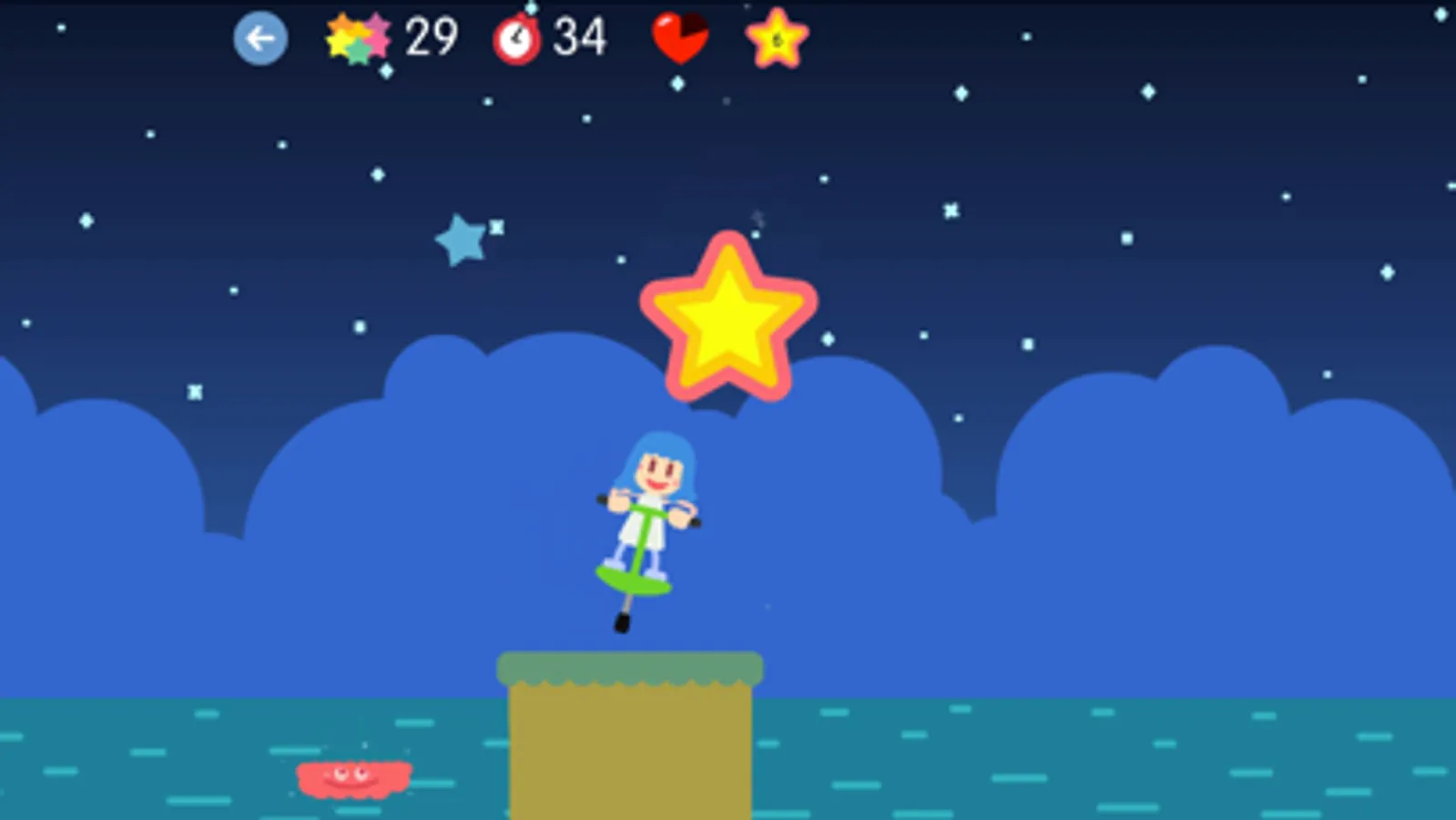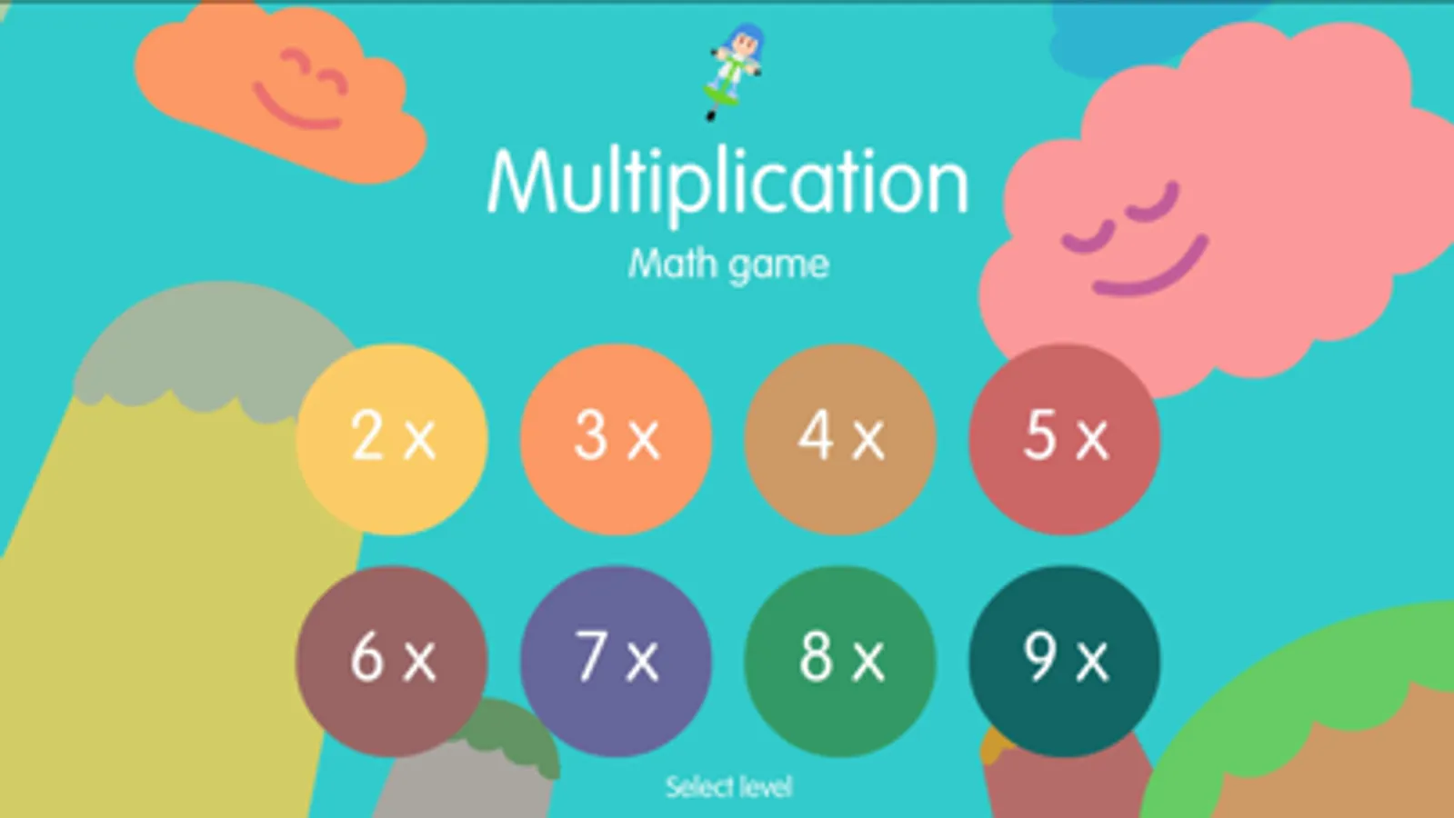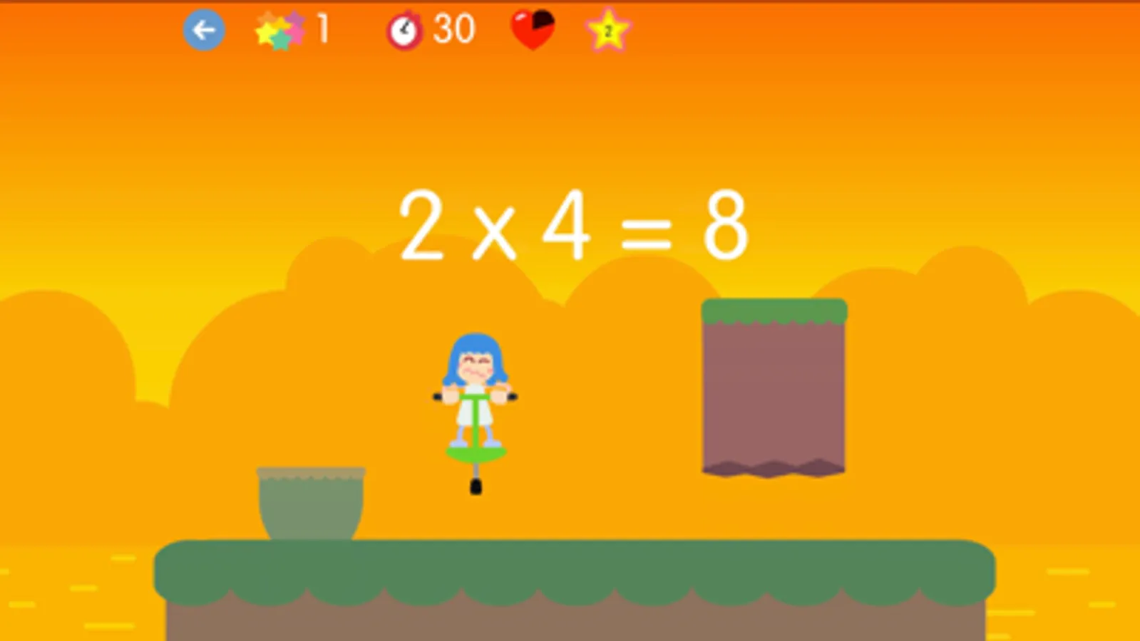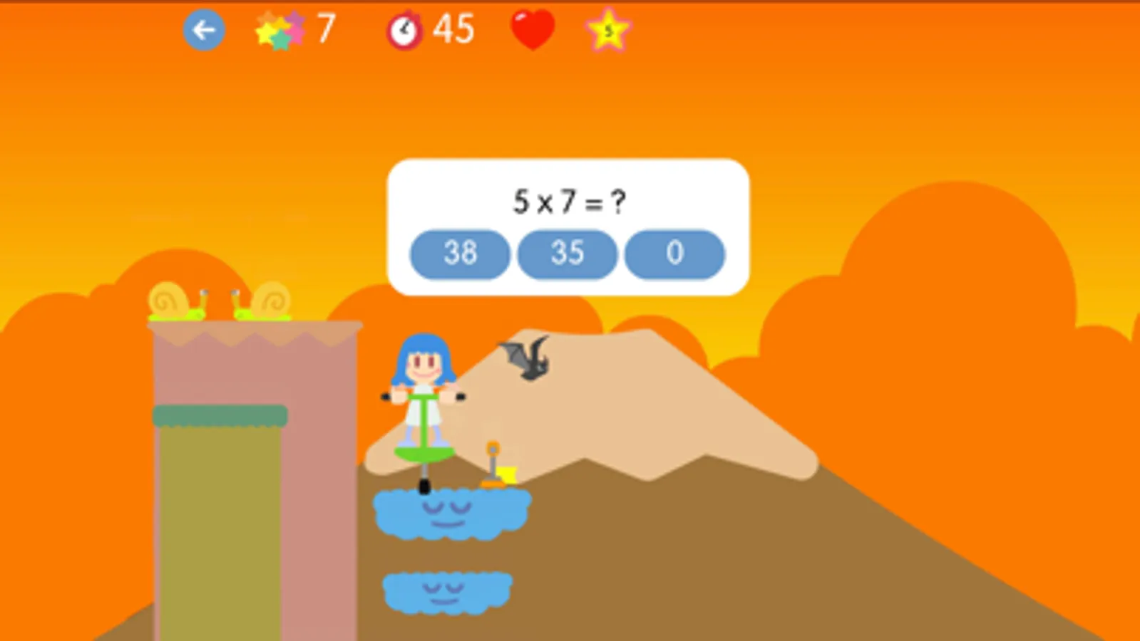 The game consists of reaching the top of the level, jumping from platform to platform and collecting multiplications to earn points. Some platforms, those in the form of a cloud, will ask for a multiplication and you must answer correctly in order to continue.