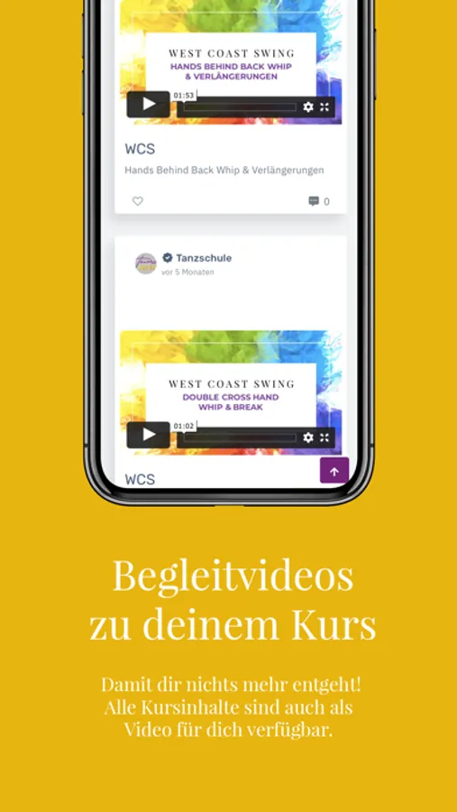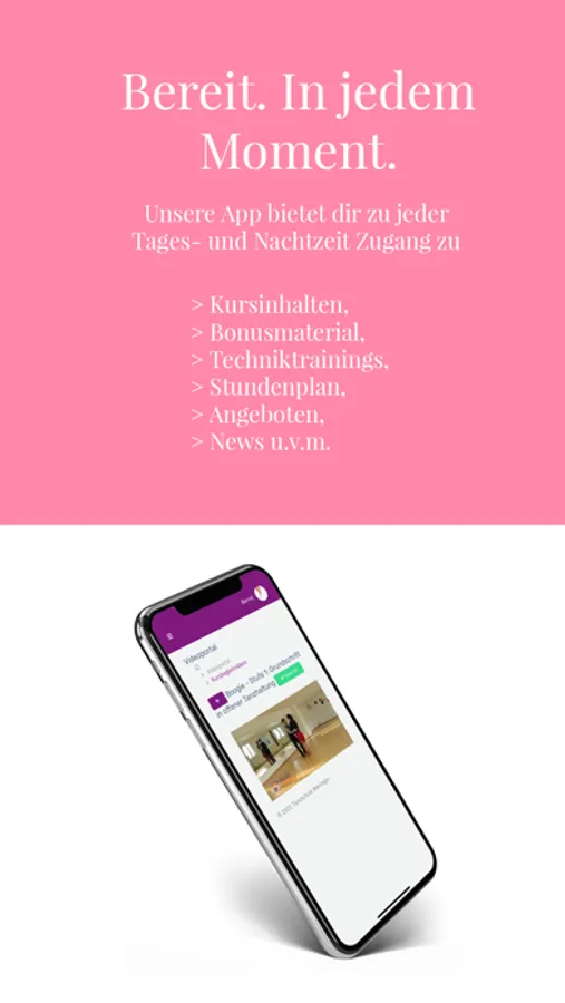 So kannst Du an jedem Ort und zu jeder Tageszeit auf Deine Kursinhalte zugreifen, Bonusvideos ansehen, Techniktrainings mitmachen, oder auch den Stundenplan und Angebote durchstöbern.