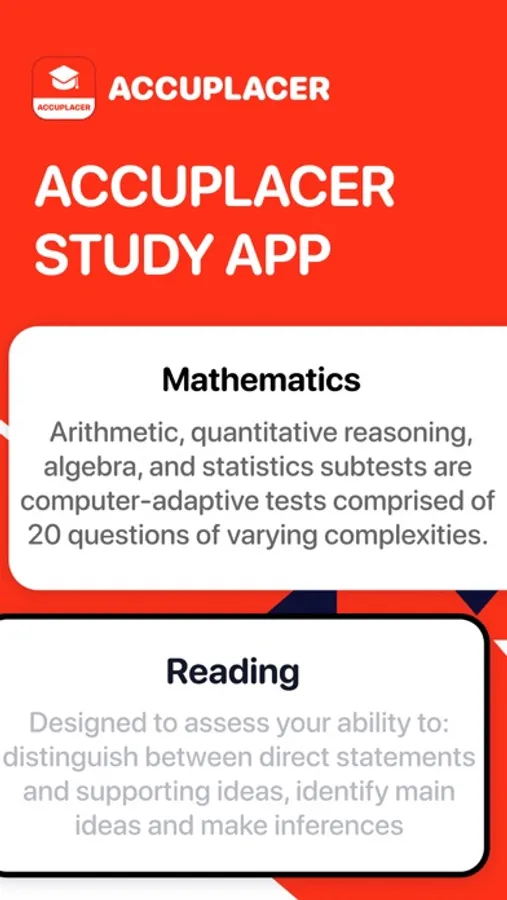 Pass your Accuplacer exam with flying colors using our Accuplacer Study App! Boost your confidence in passing first time with our mobile app and a personal study plan based on your current skill and requirements.