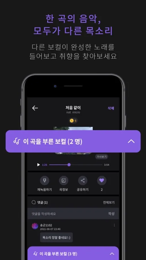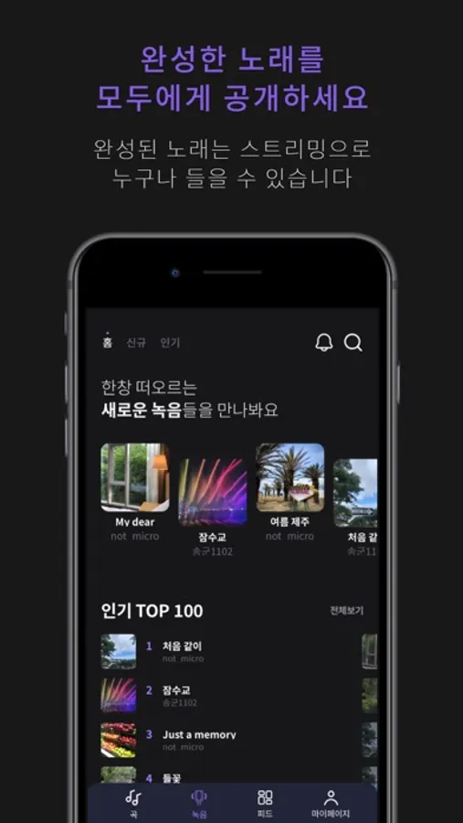 누구나 크리에이터가 공개한 창작곡에 자신의 목소리를 녹음하고 아티스트가 될 수 있어요.