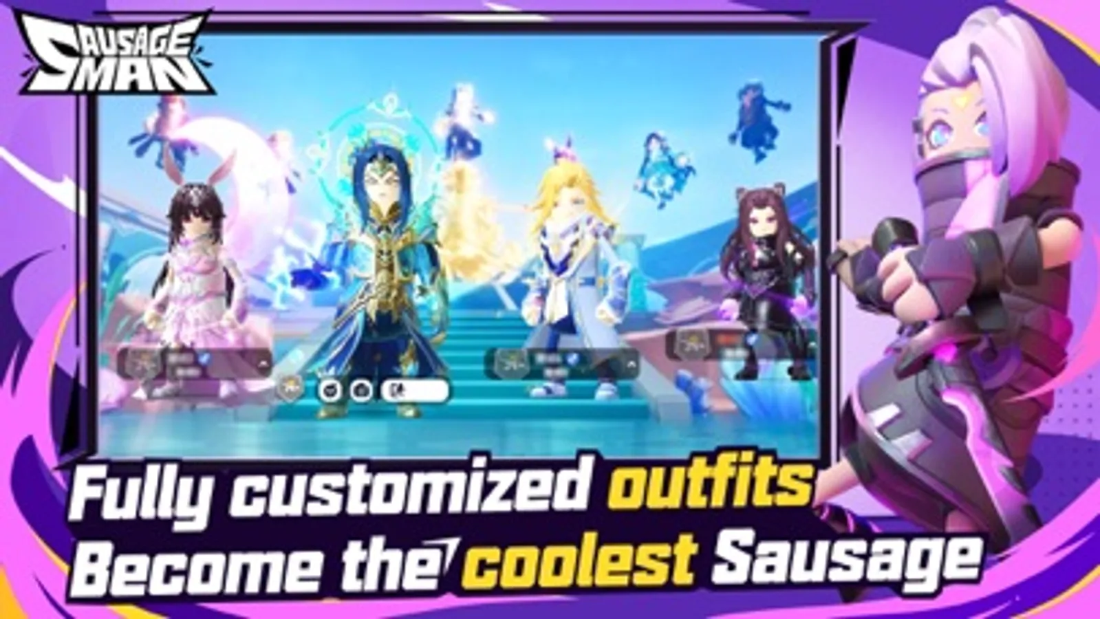 Express yourself as the coolest Sausage in the room! Customize your appearance with a ridiculous array of costumes that span a variety of themes, such as Koi, Cyberpunk, and French Maid, and emote with cute emoticons and animations. Build your reputation among your fellow Sausages with the unique Party Card system, which keeps track of your appearances, achievements and combat data!