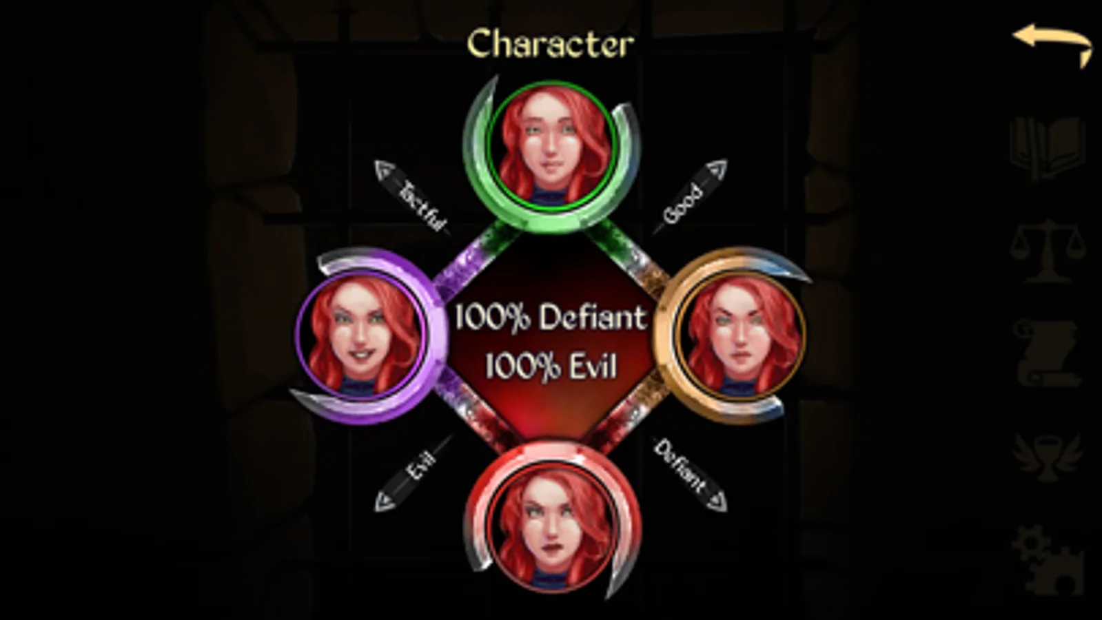 • Custom alignment system measured by two scales: Good/Evil and Tactful/Defiant.