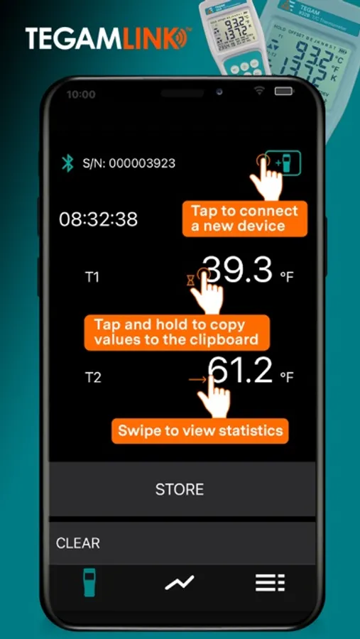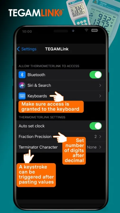 TEGAM Thermometer Link 2.0 allows you to connect your TEGAM Data Thermometer with your compatible iPhone™ or iPad™ to remotely monitor and store your temperature measurements. Set data collection parameters, clear statistics and the data table, enable the hold function, and store data points, all from your mobile device. The new keyboard extension allows you to directly input temperatures into any text field with a single tap. Temperatures can be recorded from the mobile device’s keyboard with up to 4 digits of resolution past the decimal point.