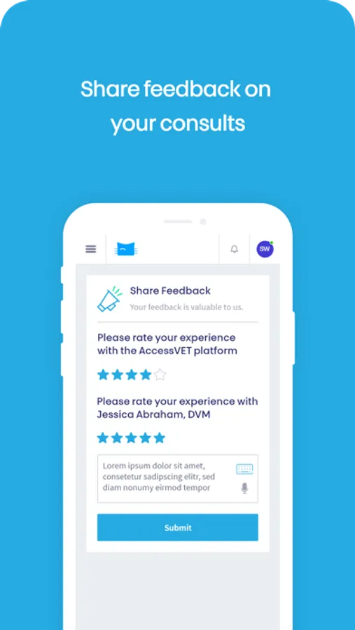 AccessVET is a secure, telehealth app for pet-friendly virtual care. Consult your vet(s) via encrypted video consultations anywhere, anytime. Sign-up to schedule your online consultations or family group calls with your veterinarians. Now you can give feedback to your experience with your vet after every consultation on the app.