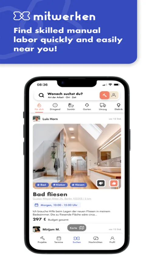+++ Simply create a profile and off you go: As a "mitwerker" you can find jobs in your area, as a client you can find competent (hobby) craftsmen from your neighborhood.