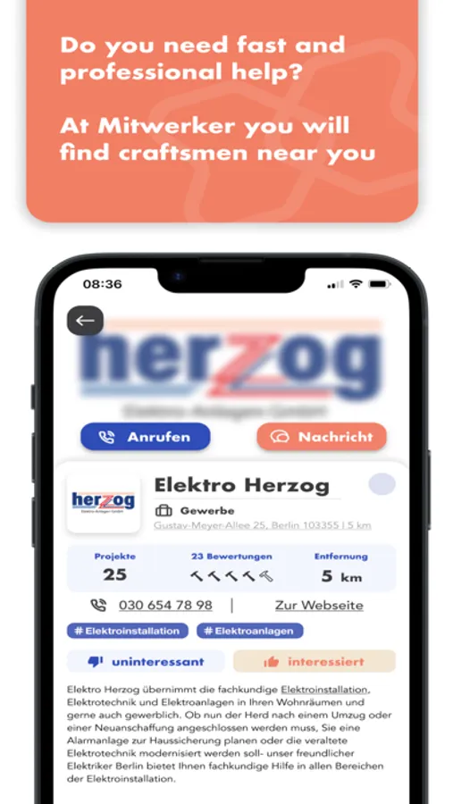 +++ Works like in any dating app: "mitwerker" and clients can like each other in advance. If there are two likes, there's a match! Then you can exchange ideas via the built-in chat and arrange a date.