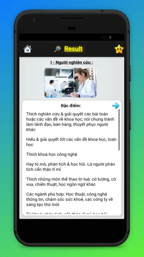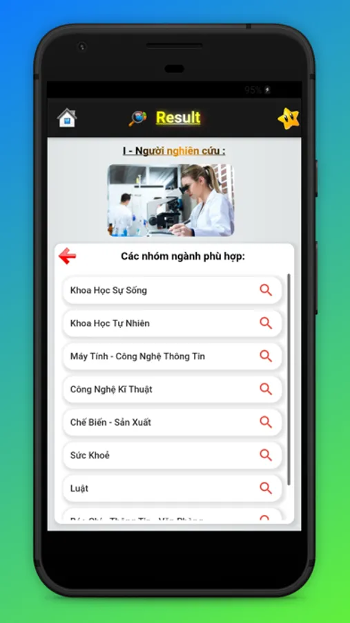 - Ngay khi tìm được sở trường, năng khiếu của mình bạn sẽ được gợi ý các nhóm ngành phù hợp với năng khiếu của bạn.