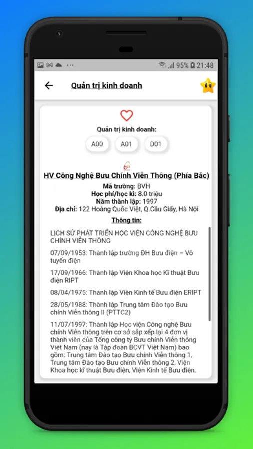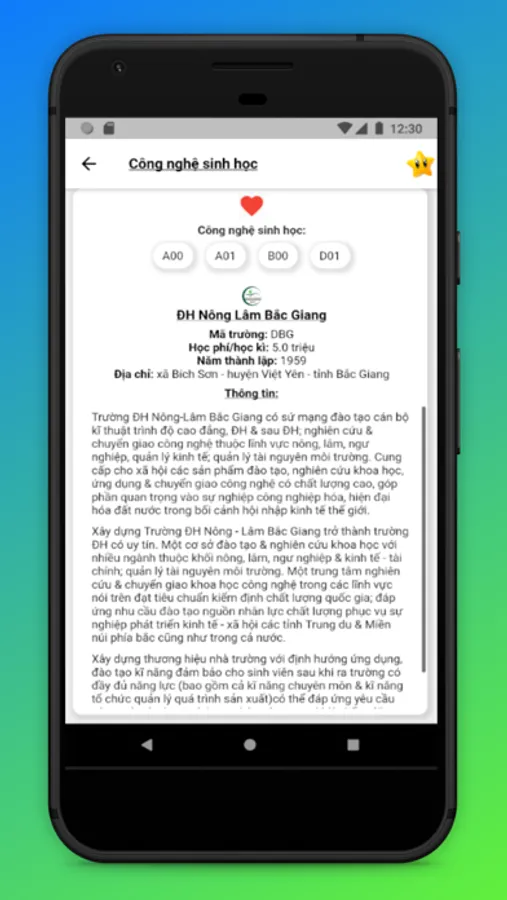 - Ứng dụng này cũng cho bạn thông tin về các trường đại học: các ngành học, khối học, học phí, địa chỉ, trường đại học hệ công/dân lập hay quốc tế, ...