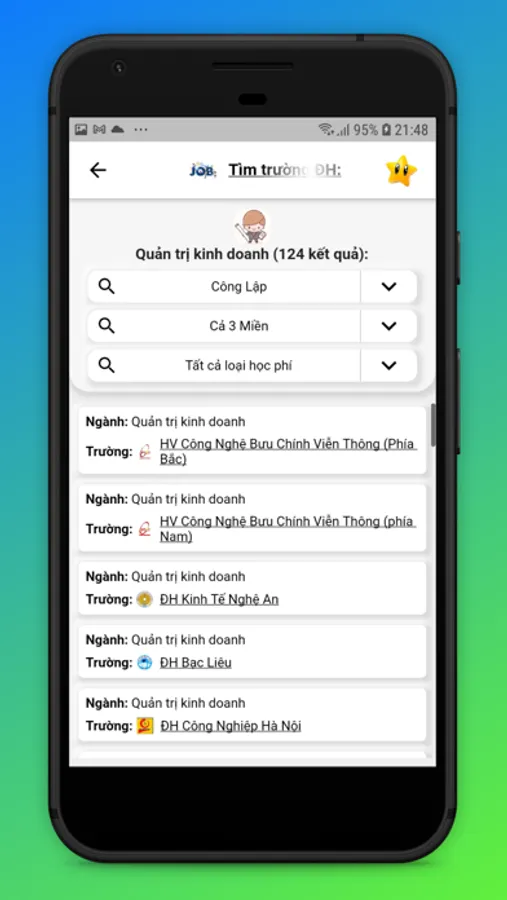 - Bạn cũng được gợi ý và tìm ngành học từ các trường ĐH từ cả 3 miền bắc trung nam.