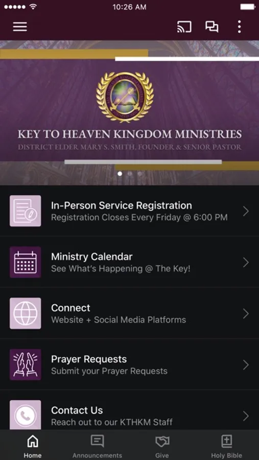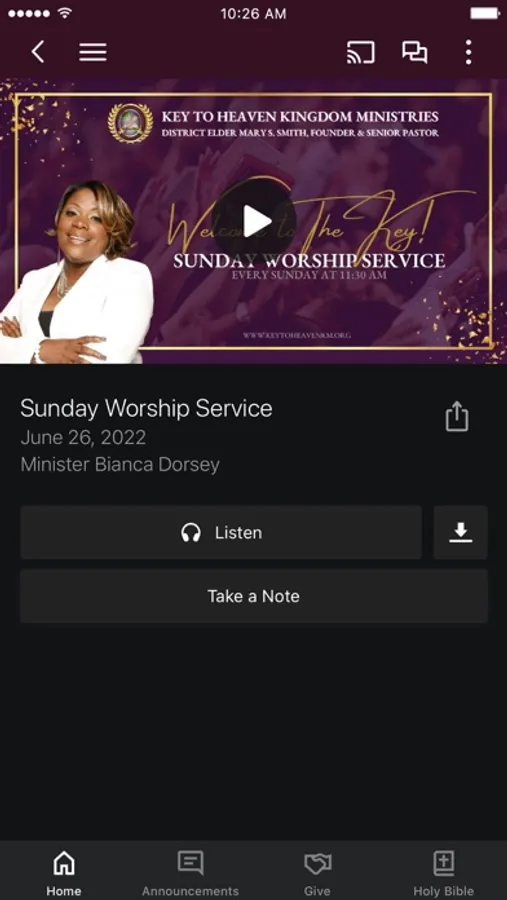 This app will help you stay connected with the day-to-day life of our church. With this app you can: watch or listen to past messages; stay up to date with push notifications; share your favorite messages via Twitter, Facebook, or email; and download messages for offline listening.