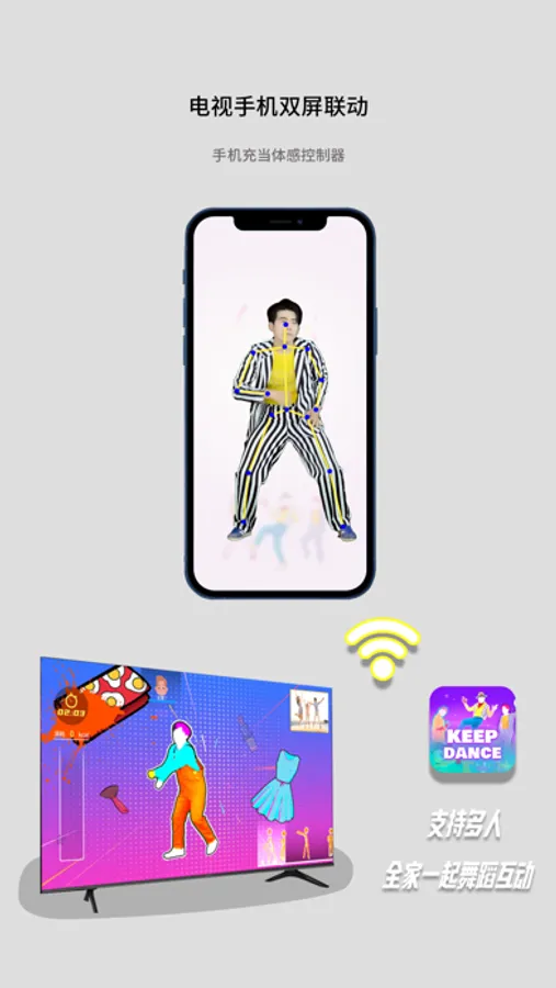在同一WIFI环境下,手机将分析的骨架数据传送给电视端进行姿势比对