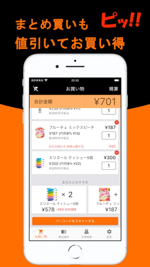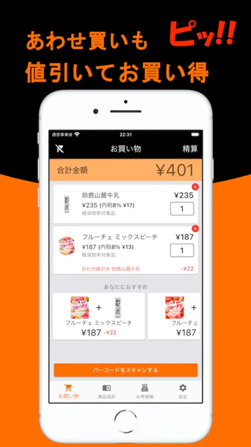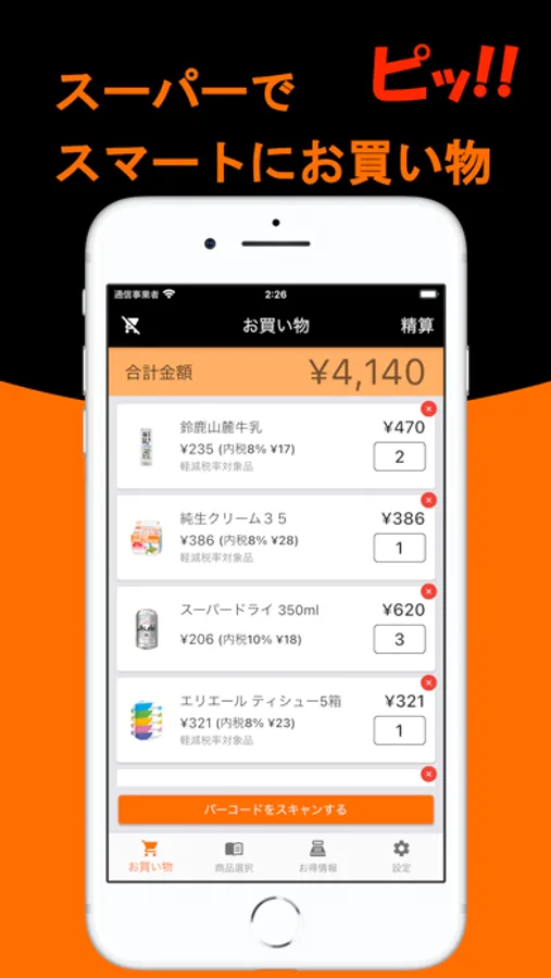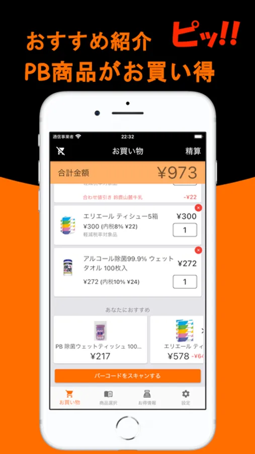 商品バーコードをスキャンするだけのシンプル操作で、買い物カートに入れる商品をリスト化します。バーコードがない商品も、商品リストから選ぶだけの簡単操作でリスト化できます。常にカート内の総量を把握できるため、あなたが買い物をコントロールすることを助けます。