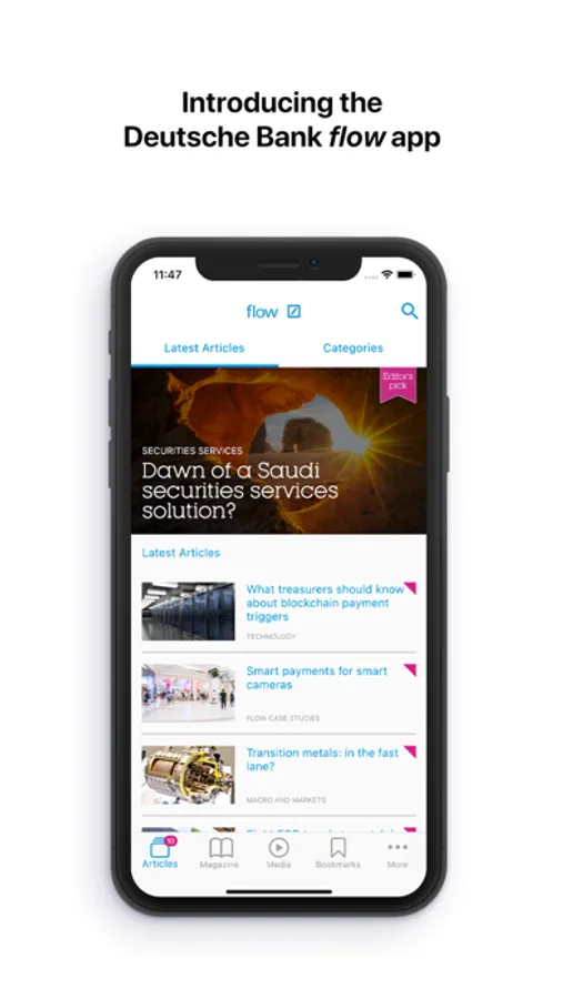 The flow app delivers exclusive Deutsche Bank insights from the world of corporate and transaction banking, plus content from our award-winning flow client magazine, all on-the-go from the convenience of your mobile. Join our 50,000+ and growing community of clients, partners and advisers! Our team of experts and editors provide regular analysis and opinion on a range of topics including cash management, macro and markets, sustainable finance, regulation, securities services, technology, trade finance and trust and agency services.