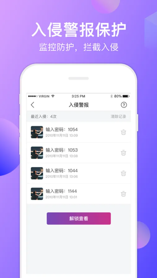 - 入侵抓拍,当检测到输入错误密码时候,系统自动启动防窥机制,抓拍下当事人及输入的密码。有助于您提高警惕,预防隐私泄露。