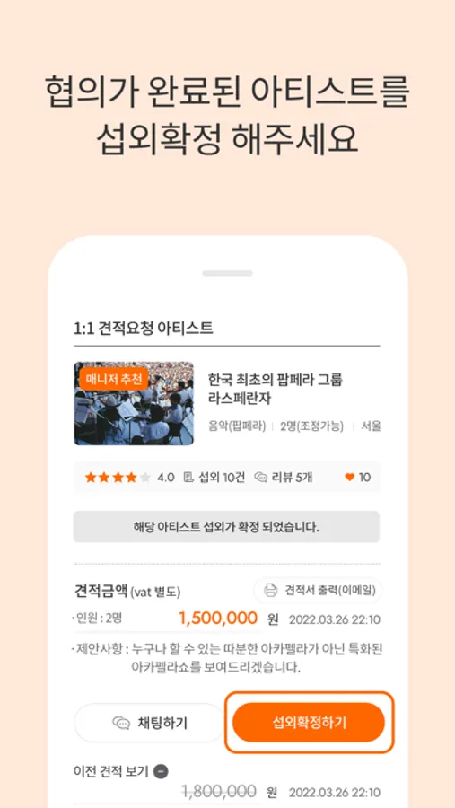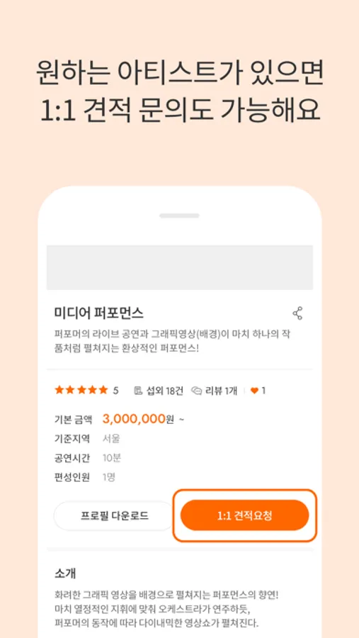 10분안에 5팀 이상 지원해 견적과 공연을 비교해 볼 수 있어요.