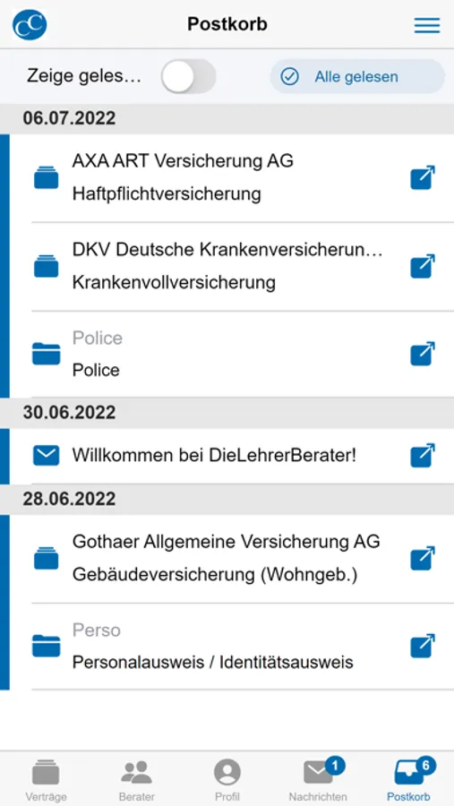 • Im Postkorb werden alle neuen Informationen übersichtlich zur Verfügung gestellt. Die Informationen umfassen Verträge, Dokumente, Schäden und alle relevanten Nachrichten.