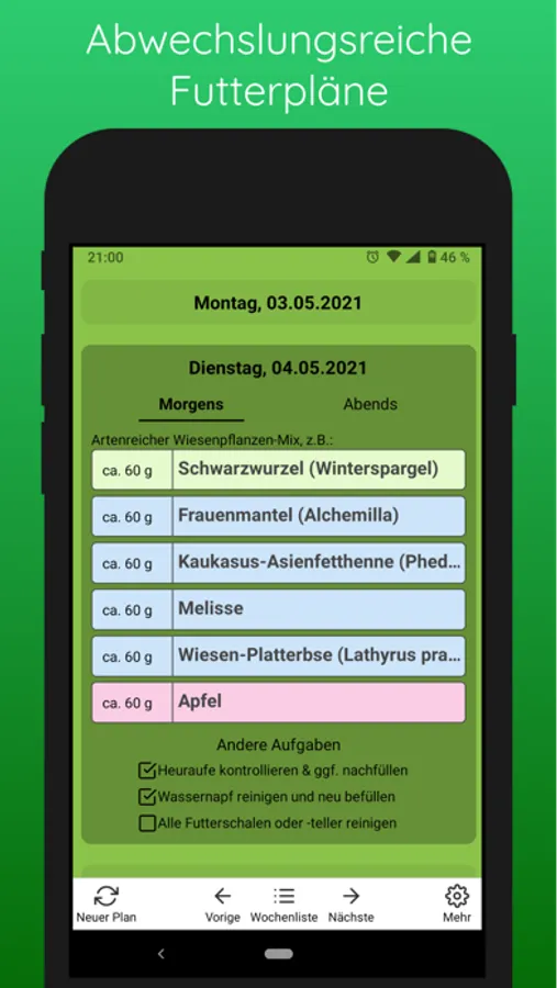 - Integrierte Checkliste weiterer täglicher Aufgaben rund um die Fütterung deiner Kaninchen