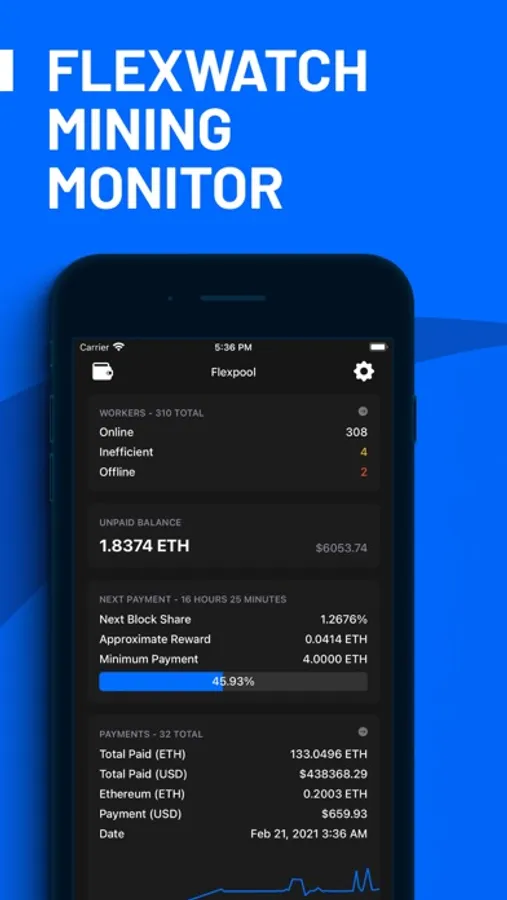 Flexwatch Mining Monitor is the most efficient monitoring app for Flexpool. It is beautiful, simple and to the point.