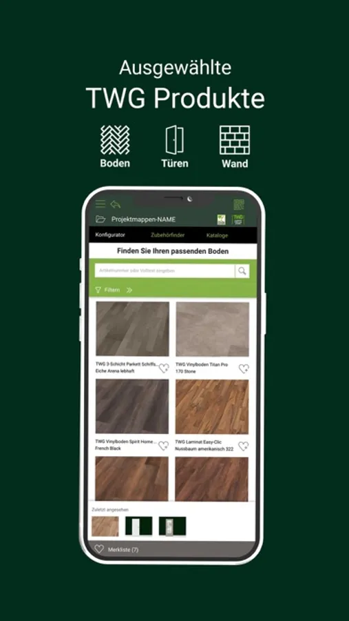 Neben der umfassenden Produktauswahl von TWG-Türen, TWG-Boden und TWG-Wandgestaltung bietet die APP viele weitere nützliche Tools rund um den Bemusterungs- und Beratungsprozess.