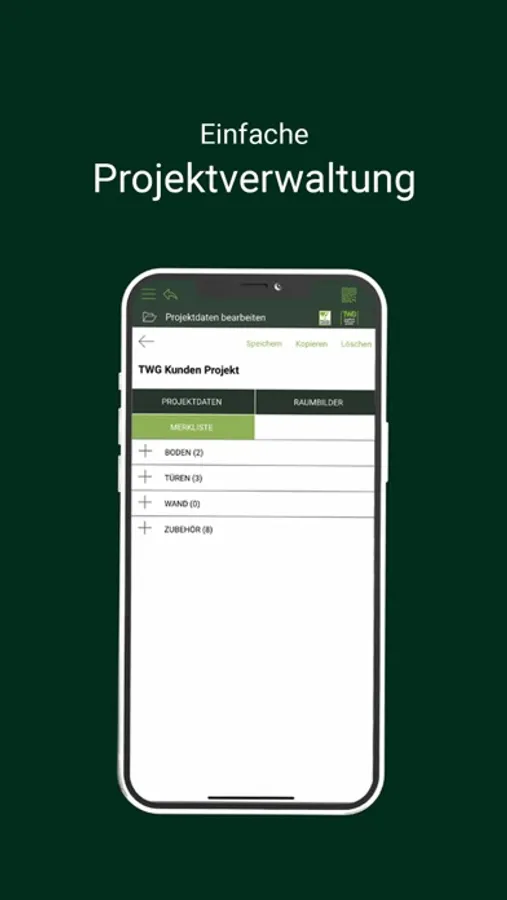 Alle Funktionen der TWG-Bemusterungs-APP im Überblick: