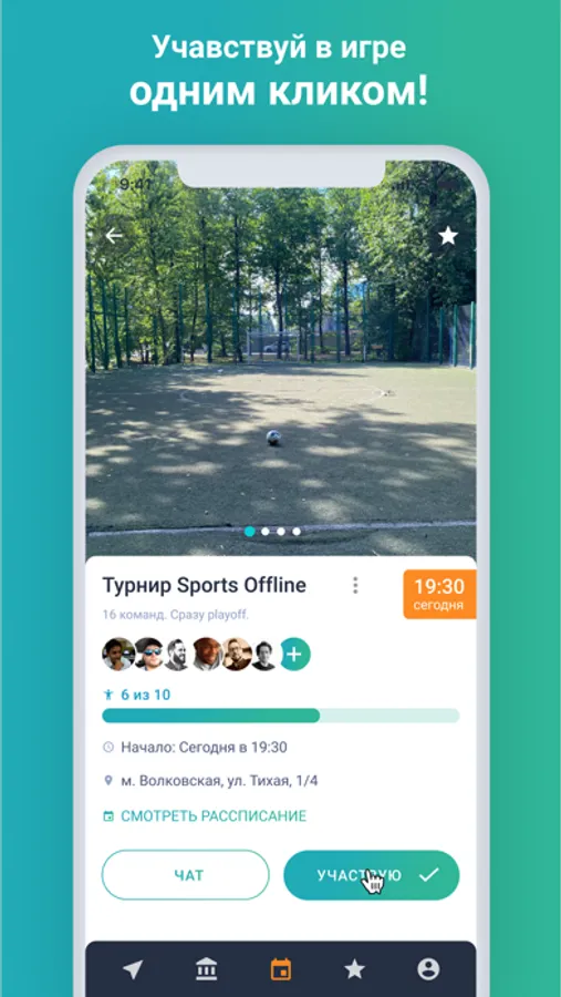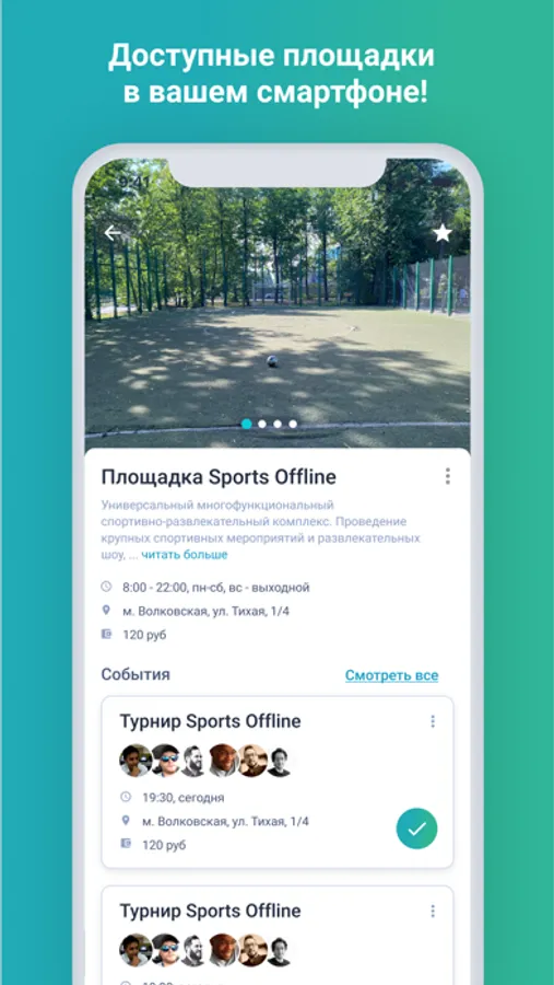 В «Sports Offline» любой человек может найти событие. Событие — это матч, который создали через приложение. Если организаторам матча нужны люди, к нему можно присоединиться одним нажатием кнопки.
