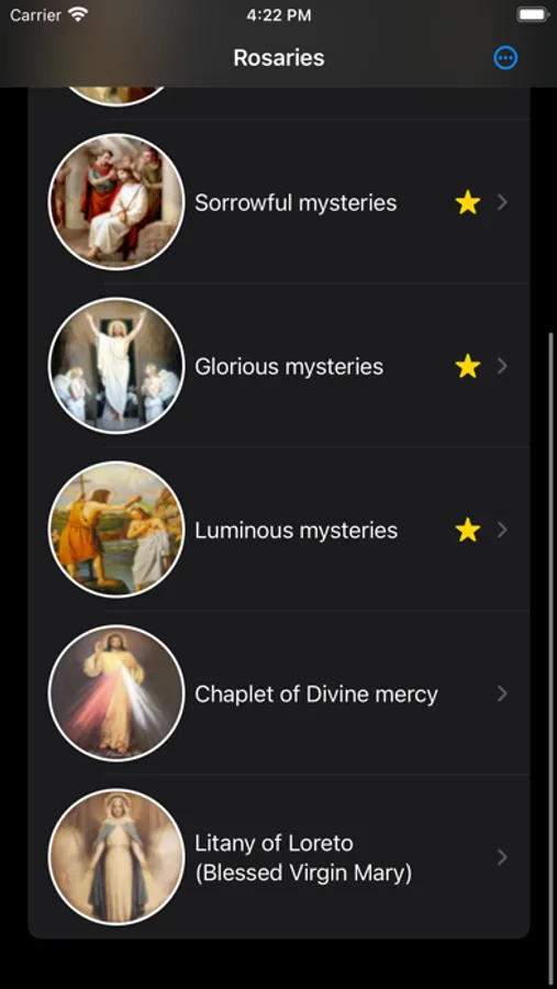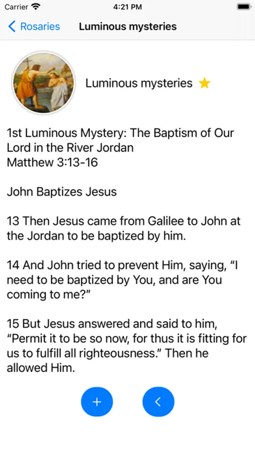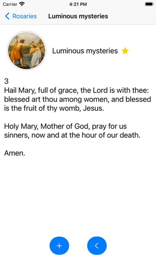 Choose the mystery for the correct week day and tap the plus button as if you were pulling the real rosary beads. If you accidentally tapped twice, tap on the back button to move back.