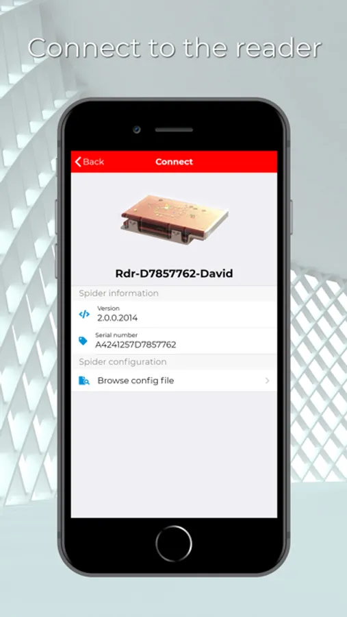 Connect and configure your Spider RFID reader using Bluetooth Low Energy (BLE). Check the RFID reader version, configuration and upload a new configuration.