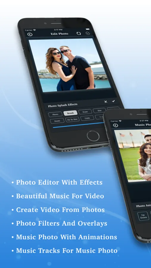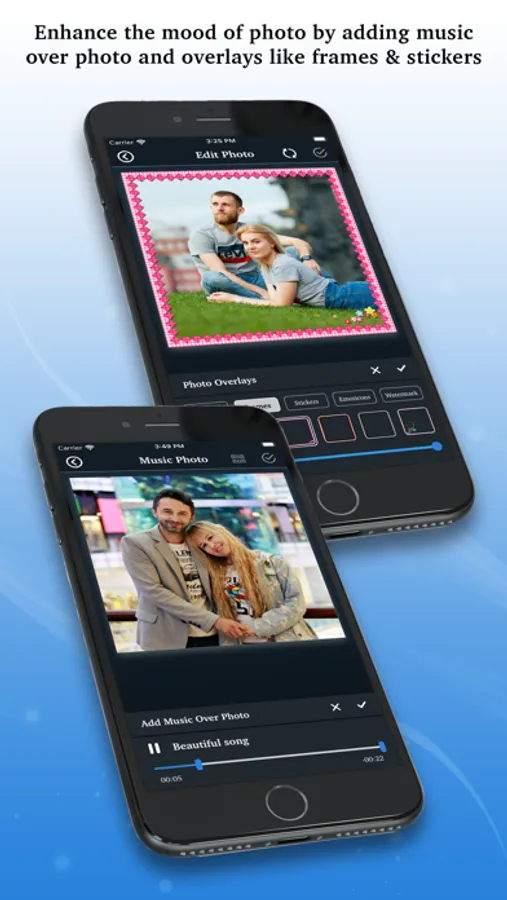 It is also easy to make photo with music and photo slideshow with multiple images with photo animation, background images, text over photo and overlays like bokeh, frames and stickers.