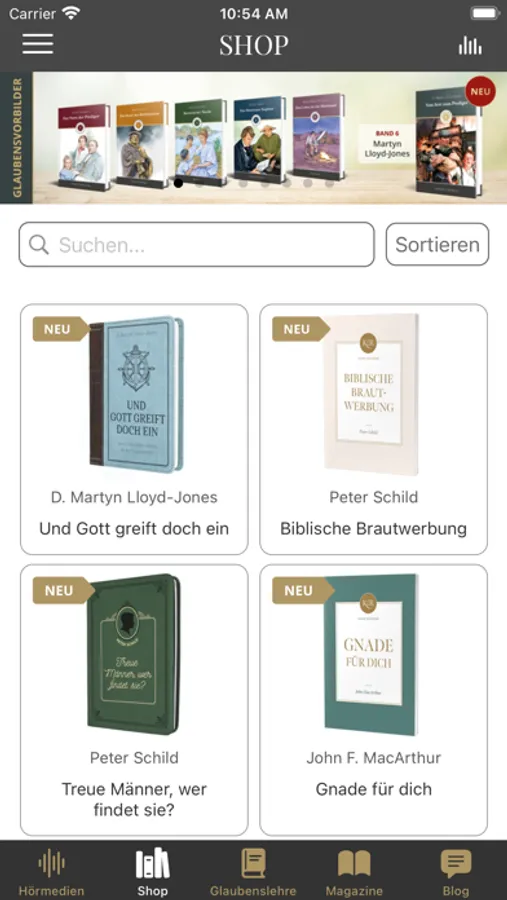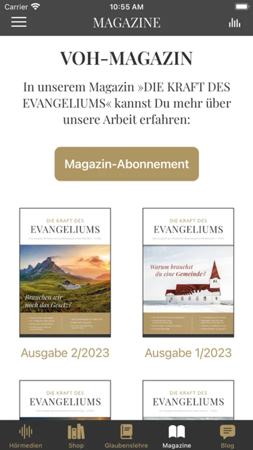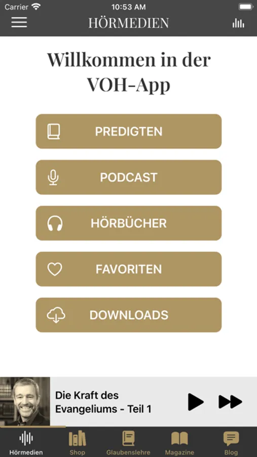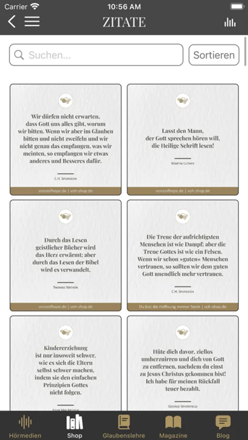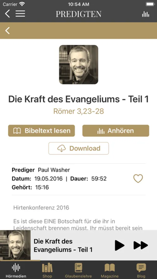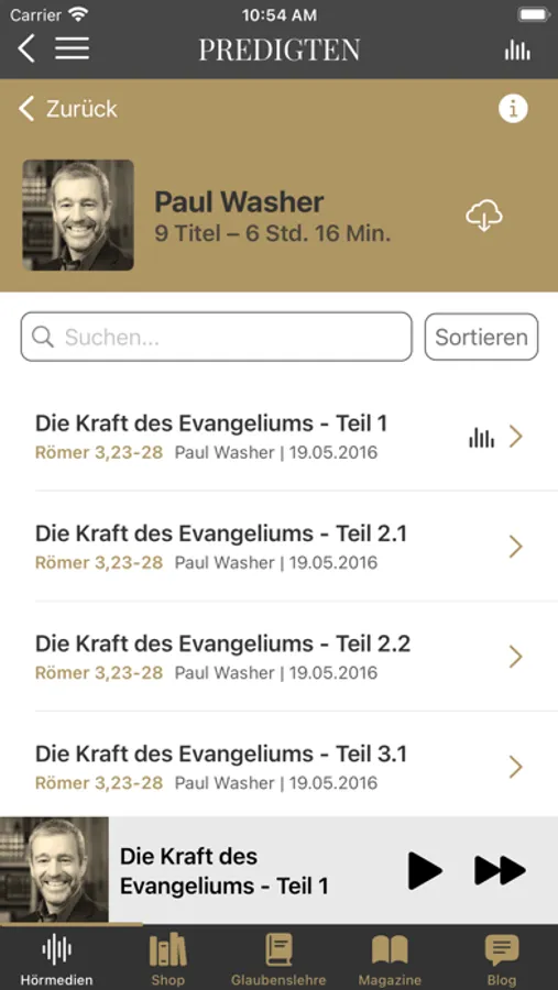 In this app you can listen to and download Bible-based sermons, audio books or podcasts from different preachers. The sermons are sorted by authors, topics, Bible books and series. There are mainly German sermons, but also English ones with German translation and Russian ones.