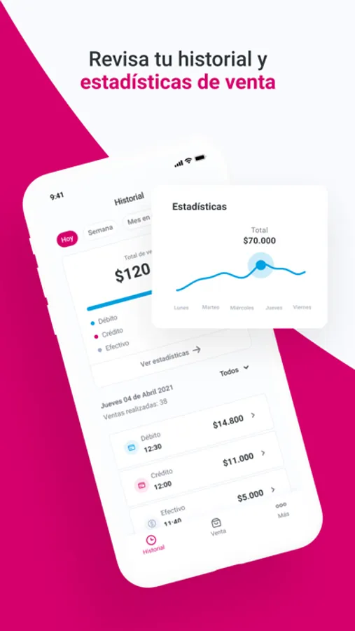 Controla tu flujo de ventas: Ten seguimiento de tus ventas y transacciones realizadas a través de gráficos diarios, semanales y mensuales.