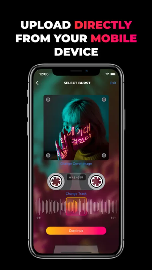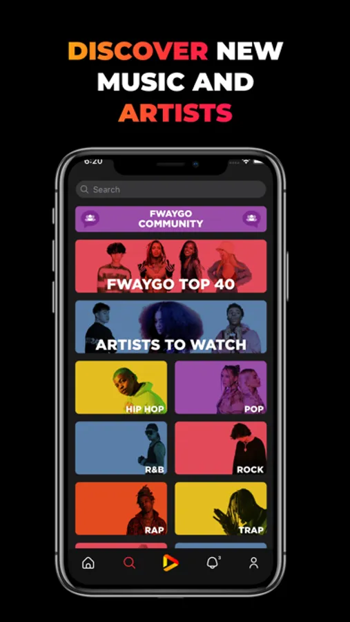 Hit the studio then publish your music straight from your phone! Uploading to FWAYGO has never been easier. Choose cover art from your photos, upload a track from your files, and select your “Burst” previewing the best part of the track. In seconds, your record is published and being recommended in listeners' feeds. Our endless Discovery feed allows you to scroll through 15-second previews of the hottest never heard before music!