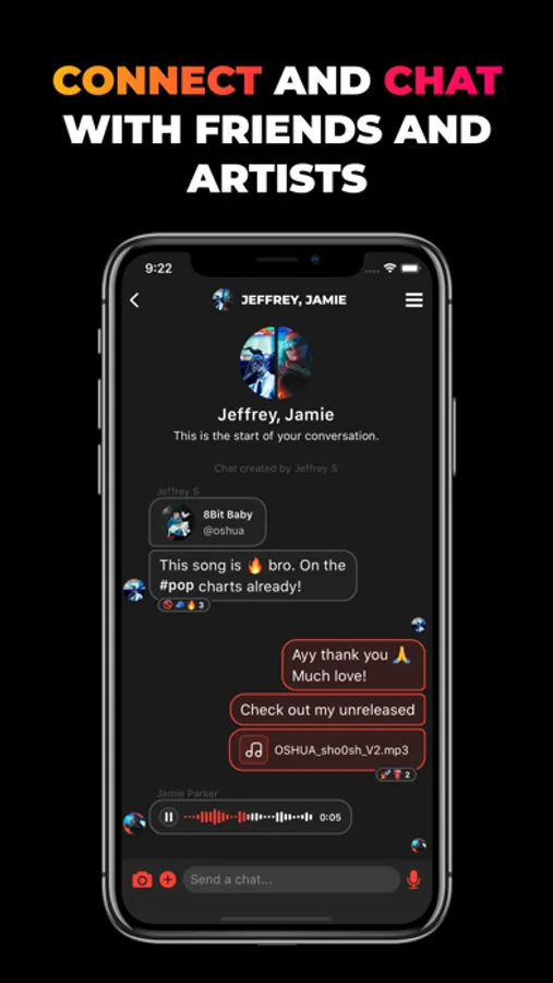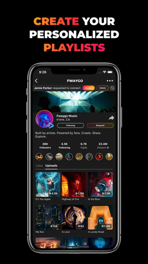CONNECT - Request to Connect with anyone on FWAYGO! Send messages to other artists you would like to work with or simply message someone you want to chat with. Create group chats, share music and make great connections on FWAYGO.