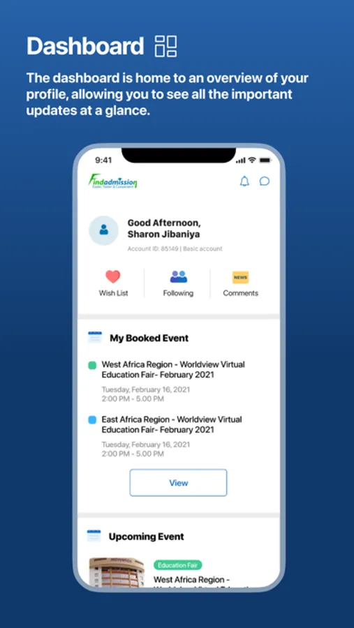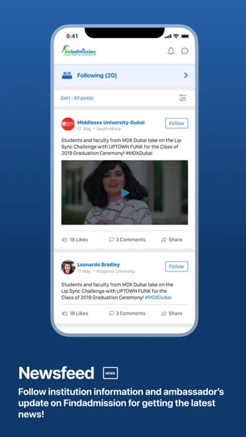 NEWS FEED: Through the News Feed, students seeking admission abroad will have access to a wealth of information and news about their prospective schools, academic opportunities, international student life, scholarships alerts, admission requirements and relevant application deadlines. They are able to view, comment on or like the posts and share them with others.