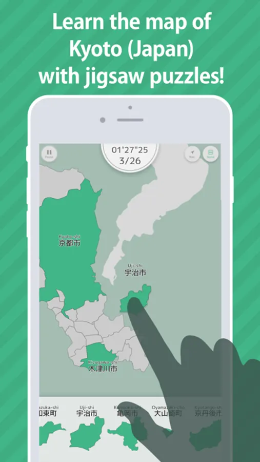 An educational puzzle game produced by Digital Gene. Memorize the cities of Kyoto (Japan) through jigsaw puzzles in this educational game focused on enjoyment and good pacing.