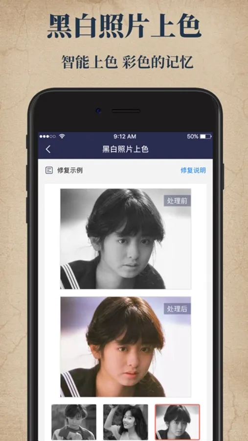 使用人工智能技术,通过大量老照片上色案例,精确还原符合场景的颜色。