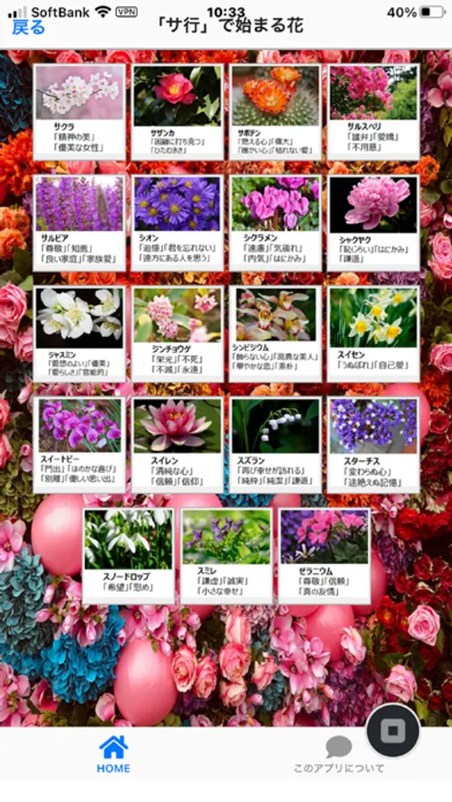 花の名前の五十音順の一覧から、参照したいサムネイル(画像)をタップすると拡大表示されます。花言葉を知ると、花を愛でる気持ちが一層強まり、新鮮な目で花を見直すことでしょう。