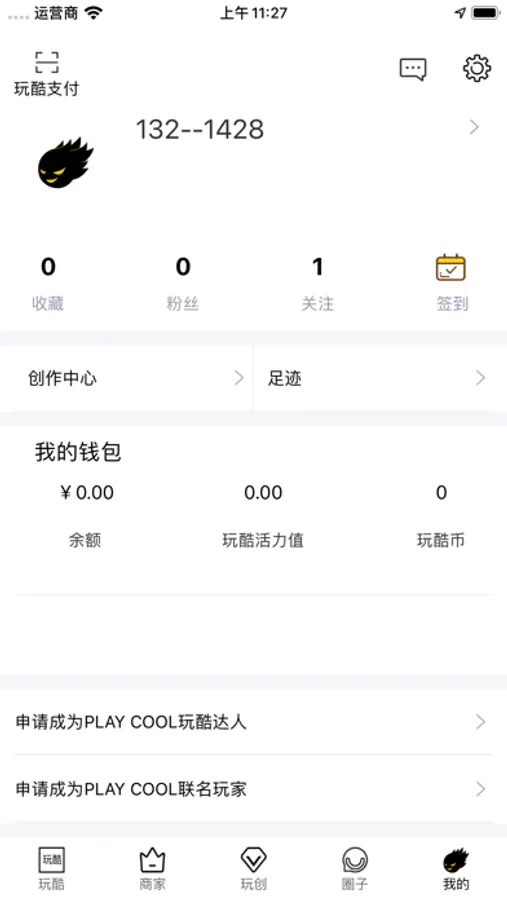 我的:可以申请入驻商家或者成为我们的玩酷达人,也可以通过特定支付获取活力值,如有疑问,请联系客服
