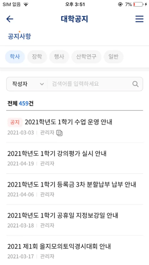 - 일반공지, 학사공지, 장학공지, 행사공지, 산학연구