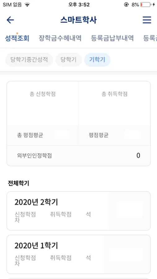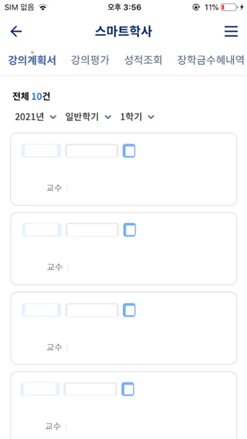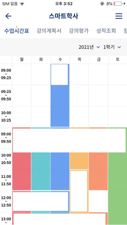 - 강의시간표조회, 성적조회, 장학금 수혜내역조회, 등록금 납부내역조회, 등록금 분할납부신청, 강의계획서조회, 강의평가, 수강신청, 학적조회, 수강생명단조회, 졸업진단