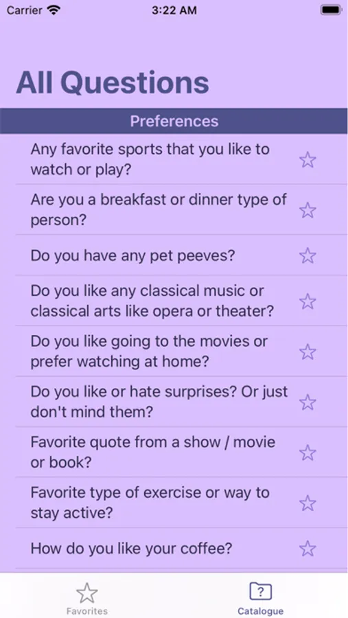 Browse through a catalog of over 150 questions to help you get to know anyone or maybe just to have some fun asking something unusual. The questions are separated into categories so that you can quickly find what is more relevant to you and you can favorite them in order to have quicker access to them for a later time. Add this app to your conversational toolbox and you'll be able to have conversations that flow a lot better!