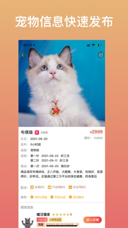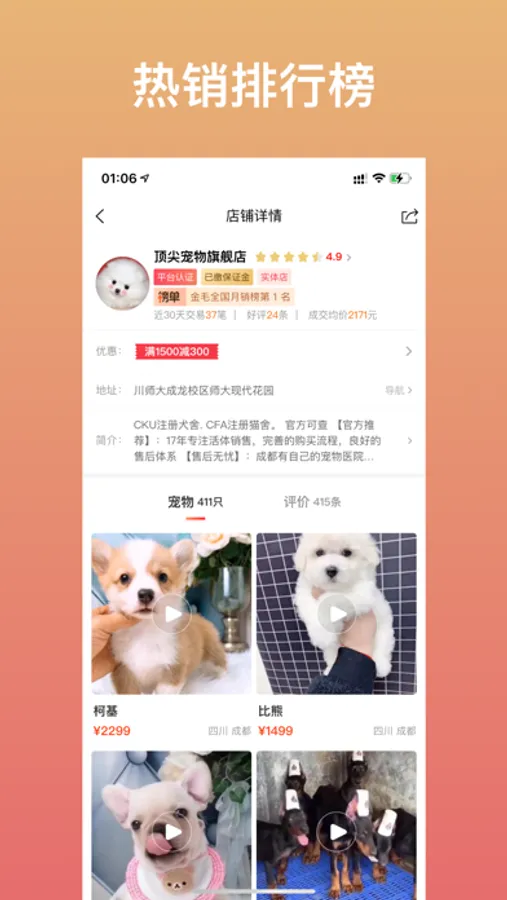 宠物市场作为专业的宠物担保交易平台,创办五年时间成为超过五百万用户选择的超人气平台,汇集全国三万多家核心宠物商户,涵盖狗狗和猫咪,让您足不出户邂逅自己的宠物伴侣。全新推出用品商城,精选千余款宠物用品,涵盖猫粮、狗粮、零食玩具、日用洗护、保健医疗等,秉承“正品低价”的理念为养宠人士提供一站式养宠体验!