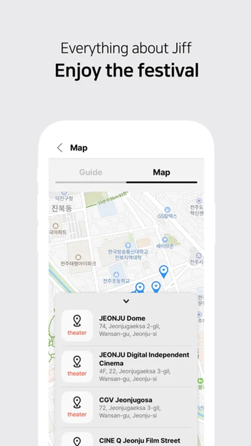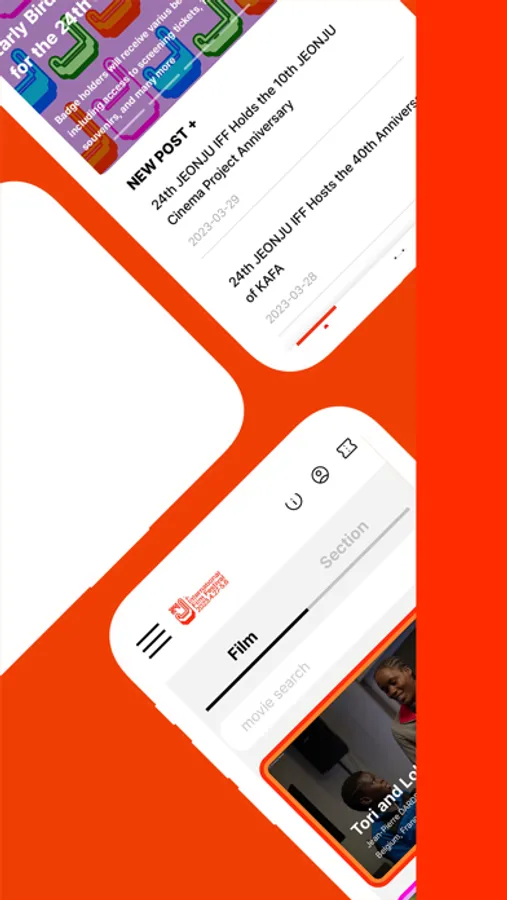 You can access the information necessary to enjoy the festival under the Festival Info and the Festival Map tabs. The latest news on the JEONJU IFF, such as announcements, press releases, newsletters, and magazine articles, will be updated in real time, and you won’t miss a beat during this festival season if you turn on the push notification service to receive important messages regarding schedule changes and other updates.