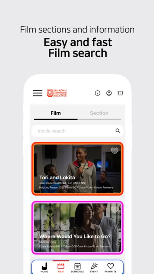 Using the JEONJU IFF’s official mobile app, you can access the information on 247 films from 42 countries, which will be screened at the 24th JEONJU IFF, as well as offline screening schedules, Program Events such as Guest Visit sessions (GVs), and Additional Event schedules.