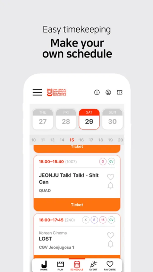 JEONJU IFF members can log in to the app to purchase mobile tickets, and view purchased tickets. Guests who have been officially invited to the 24th JEONJU IFF can link their guest badges to the app and access their mobile badges.