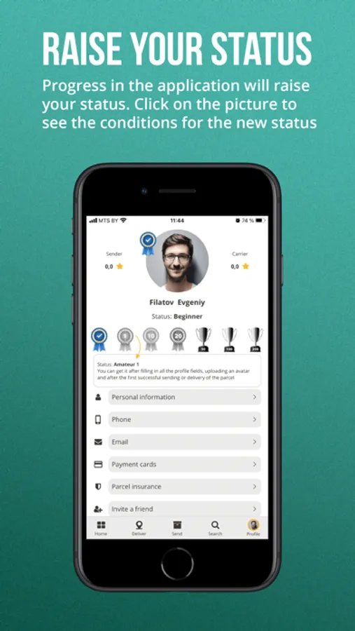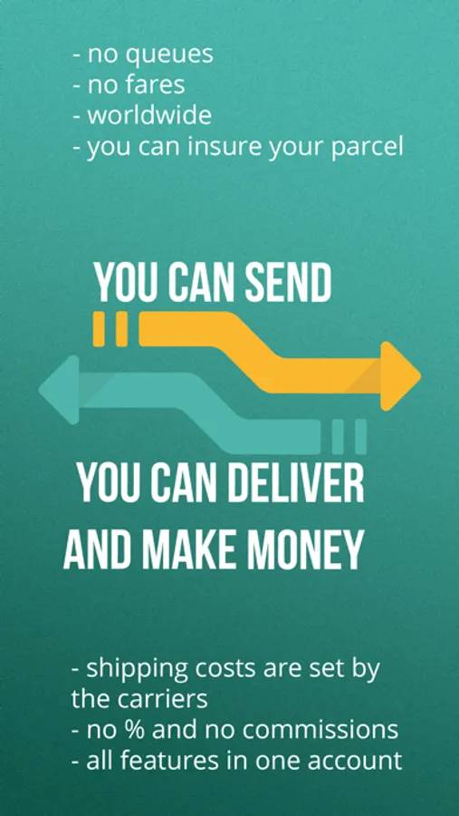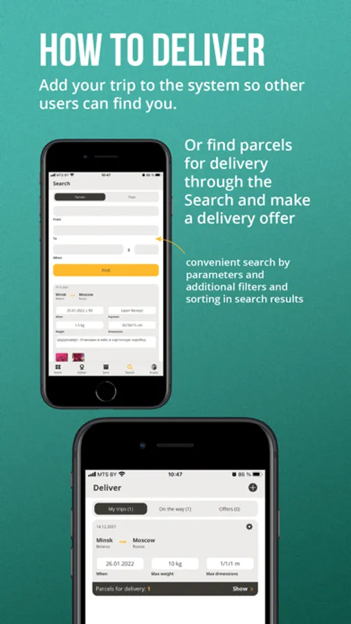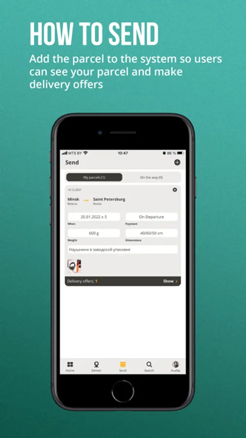 Add your route to Trips, add parameters of the parcels that you are ready to take with you, and receive parcels for delivery. Deliver parcels and recoup part of the travel costs. You set the cost of your delivery services yourself.