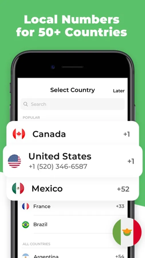 Support for many international phone numbers including United States US, United Kingdom UK, France FR, Brazil BR, Canada CA, Spain ES, Mexico MX, Australia AU, South Korea KR, Japan JP and over 40+ countries!